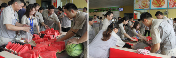 開餐時(shí)間到了,員工陸續(xù)來到餐廳,帶著一身暑氣,拿起西瓜咬了一口,從他們豆大汗珠的臉上,能感受到那份幸福與清涼。